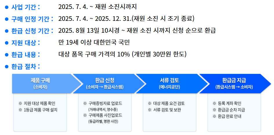 사업을 통해 소비자는 초기 구매 비용의 일부를 돌려받아 경제적 부담을 줄이고, 장기적으로는 전기요금 절감 혜택을 누릴 수 있습니다. 국가적으로는 전력 수요 관리와 온실가스 감축 효과가 동시에 발생하여 친환경 정책 추진에 중요한 역할을 합니다.