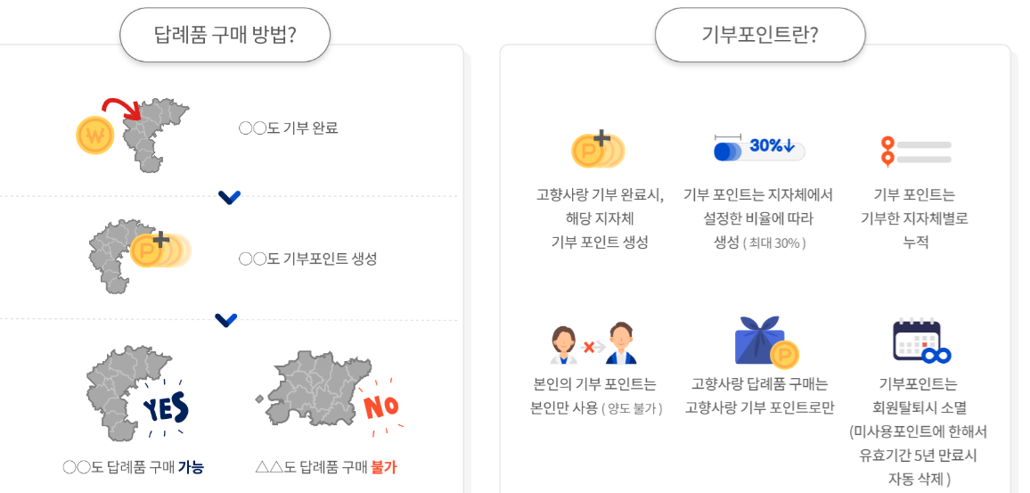 - 답례품: 기부금의 30% 이내, 특산품·체험권 다양